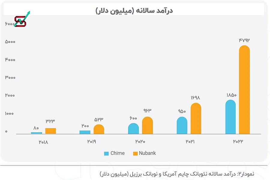 جمع درآمدهای دو نئوبانک چایم و نوبانک به رقم 12.17 میلیارد دلار تا سال 2022 رسیده است.
